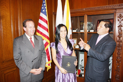 21日在市长办公室国际厅代表旧金山接待韦唯的是市长办公室国际贸易主任钱德勒 (Mark Chandler) 和湾区捷运董事方以伟。钱德勒表示,旧金山市府没有颁发“荣誉市民”的惯例。市长纽森签署的荣誉状 (Certificate of Honor)就是对来访者致敬的方式。纽森在荣誉状上赞扬韦唯对美中两国友好关系的贡献,并对她来旧金山参加“同一首歌”表示荣幸。