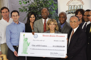 中新网10月16日电 据美国《侨报》报道,美国经济萧条还没有走出低谷,联邦财政预算捉襟见肘。14日在帝王郡艾尔森特市政府(El Centro, Imperial County)举行颁奖典礼,联邦商务部经济发展局(EDA)表彰华裔开发商美国YK集团(YK America Group),对美国经济和创造就业的贡献,并奖励给他们由商务部长骆家辉签名的320万美元支票,用于商业开发区水电和道路的基础建设。