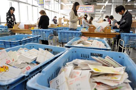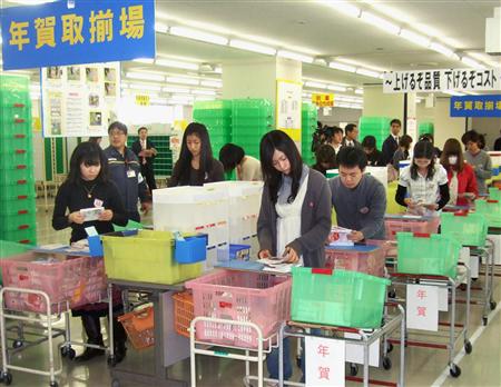 在中国时我就一直对邮局工作感兴趣,每当看就我家附近的邮局工作人员拿着邮戳在敲时,我觉得他非常有劲。但是一走进日本的邮局完全与中国不同的景象,工作环境是很静,也没有打打闹闹的现象。因为年末年初短帮工都是学生,所以就被分配到内勤组,专门分发由机器分拣的明信片的具体分发事宜。何谓机器分拣呢?在日本的各个邮局都有一台自动分拣机,可以把信与明信片分到地区(番地),这样我们就在地区内一家一家具体分发到各家的格子里去。一开始几天每个格子没有几份明信片,但是随着时间的增长,明信片越来越多,明信片多的人家我会用皮筋一百张左右捆起来,放到一边继续干下面的工作。据说我们家那个邮局每年的明信片数量在1200万左右,大约平均1个人有120张。日本邮局的重要收入就在于销售明信片。