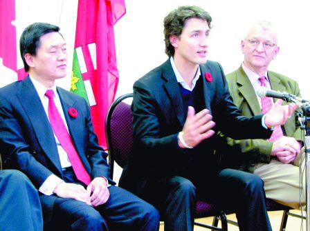 中新网11月12日电 据加拿大《明报》报道,加拿大前总理杜鲁多儿子,被视为政坛未来新星,现为蒙特利尔国会议员兼自由党青年及多元文化事务评论员的贾斯廷(Justin Trudeau),10日到访以其父亲命名,位于万锦市的Pierre Elliott Trudeau High School之余,顺道探访万锦加华联会,并与中文传媒会面,除分享其个人对从政感受之余,并收集华社对政府有关政策意见,以便在国会做出反映。
