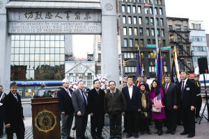 下午,纽约华裔美国退伍军人会在华埠华裔军人忠烈坊举行另一个纪念仪式--向华裔军人献上花圈,呼吁人们勿忘华裔军人对美国作出的贡献。