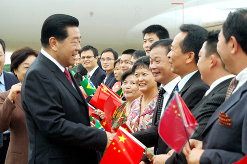 贾庆林抵巴西访问 近百华人华侨代表赴首都欢迎