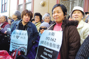 八名年龄在69至89岁的长者,居住在北岸的一栋老楼中公寓已经有几十年。华协中心公布的资料显示,大厦易手,新业主在2007年11月购入后, 为了谋求更多利润, 在去年以“艾利斯法案”要求所有住客在120天内迁出他们已居住了差不多半个世纪的家园, 并把公寓转为“产权共有”。虽然业主的逼迁限期早已过了数周,这些无助的长者坚决在寒冬下守护家园。