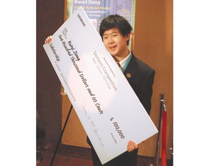 中新网12月9日电 据美国《星岛日报》报道,被誉为“高中诺贝尔奖”的“全美西门子科学竞赛”当地时间7日在纽约大学宣布2009年度竞赛获奖名单,得奖者中逾半数为华裔。来自纽约长岛Ward Melville高中的华裔学生江若夷(Ruoyi Jiang)在个人组竞赛中拔得头筹,由德州华裔学生刘丹(Dan Liu)、陈逸宁(Kevin Chen)与佛州队友卡森(Sean Karson)组成的队伍摘得团体组一等奖。