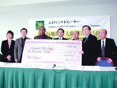 在当日记者会上,多个机构以不同方式为海地大地震赈灾:湛山精舍捐款1.5万元﹑多伦多香港狮子会捐款1万元﹑多伦多雅贤狮子会5000元﹑多伦多柏丽狮子会5000元等。而也有团体则以摊位义卖物品﹑发动会员捐献……务求尽一分力﹑发一分光,帮助海地灾民早日恢复正常生活。