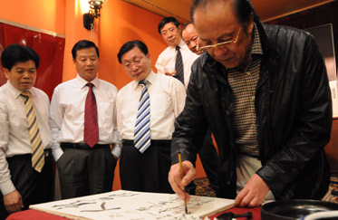 晚宴上,著名歌唱家杨洪基挥毫洒墨,为阿根廷华人华侨联合总会题字,代表团成员也一一落款签字。
