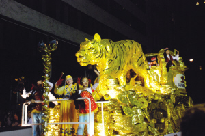 已有百年历史的“中华总商会”等横额走在队伍的前面,还有迎风招展的生肖彩旗;虎年彩旗比别的彩旗大出一号,旗手将大旗来回挥舞,在晚空中猎猎生风。舞龙舞狮队伍行进途中,但见龙逐火球盘旋,狮随鼓点起舞。湾区很多中文学校或有教授中文的小学都派出队伍参加游行,小学生们除了沿途表演舞蹈外,还似模似样地舞起小狮和小龙,为游行增添热闹的气氛。