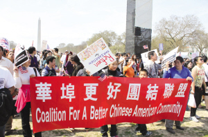 估计有1千多华人参与了21日下午在华府国家广场举行的移民集会和游行,这是近年来华人参与移民权益游行最踊跃的一次。