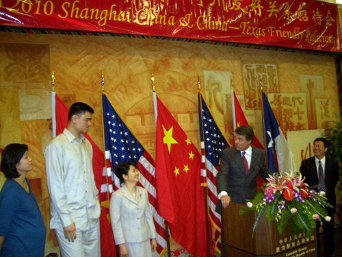 作为特别的嘉宾,姚明也发表了感言。他出生在上海,对上海有着特殊的感情。在德州休斯顿打球几年来,他觉得也有必要向家乡和祖国人民介绍德州“牛仔们”的生活和经济文化科技发展状况。他非常高兴佩里州长能亲自率团参加上海世博会。