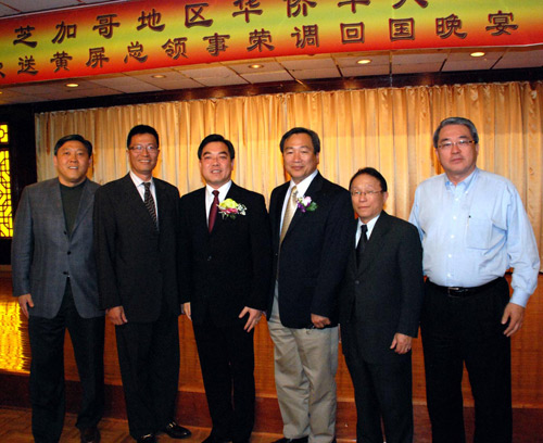 中新网4月28日电 据美国《芝加哥华语论坛》报道,当地时间4月26日晚,大芝加哥地区五百多位侨胞怀着依依不舍的心情,在南华埠富丽华大酒楼盛情欢送总领事黄屏荣调返国。在座无虚席的晚宴上,侨社团组织的代表和黄屏总领事都上台致词,他们满怀深情的讲话和真挚友情的流露,获得全场的强烈共鸣。芝加哥市长代表李双振、华埠所在区区长苏礼士及夫人、电视七台主播于小玲等也应邀出席。