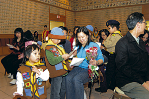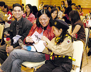 与丈夫史文山在教国际标准舞的沈柏容,在看到9岁的女儿史洛谦,送了张印有一个大大“孝”字的卡片和一大花束康乃馨时,笑得合不拢嘴。佛光童军小兄妹谭明骏和谭明丽,也各送了张“孝”卡给妈妈王淑芬。王淑芬说,能在佛光山收到子女的爱心卡和康乃馨,很有意义。
