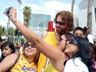 尽管活动是11时才开始,尽管当天是周一上班日,但上午8时不到,洛杉矶市中心已经挤满来看游行的热情球迷,街上一片紫金潮(湖人队象征颜色),相当缤纷亮丽。