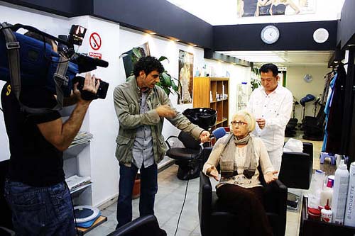 一些正在做头发的西班牙顾客接受记者与巴塞罗那电视台1台记者的共同采访。