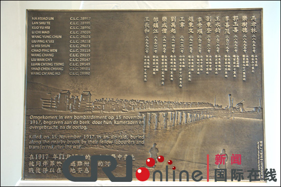 纪念碑上刻上了当年遇难的13名华工的姓名。实际上,他们只是一战中遇难华工的极小一部分。