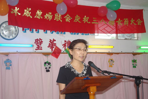 冰威廉妇联会会长田丽英也发表了讲话。她说,冰威廉妇联会成立以来每年都会举办“三八”和父母亲节庆祝活动,都得到姐妹们的大力支持。今天的庆祝活动特别邀请到了中国驻毛首位女大使,大家感到更加高兴和荣幸。她呼吁妇女姐妹们更加关心国家大事,积极融入当地主流社会,做到既是家庭中的好主妇,又是社会中成功的一员,真正发挥“半边天”的作用。