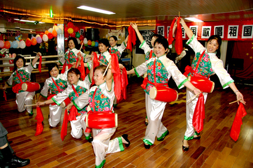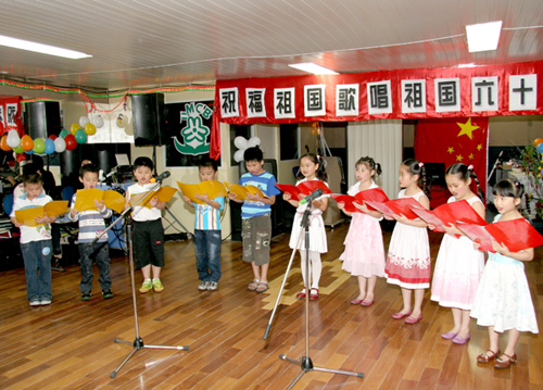 当天的联欢会上,妇女会的姐妹们表演了新创作排练的腰鼓舞蹈,育才学园小朋友们表演了集体诗朗诵,赵永平、惠青等朗诵了《祖国我爱你》长诗。在王燕文小姐领唱下,全体与会人员还起立演唱了歌唱祖国的大合唱。随后,赵永平会长、孙总领事以及与共和国同龄的姐妹们一起切开了庆祝祖国六十周年的生日蛋糕。