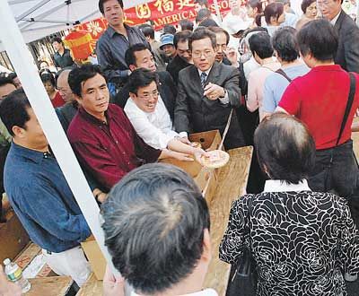 中新网9月23日电 据美国《世界日报》报道,今年的农历中秋佳节落在10月3日,美国福建同乡会21日与20多个社团和政府部门在纽约曼哈顿华埠举行盛大的“中秋福建街坊节”,吸引超过5000民众参加,其中大部分为闽籍乡亲,也有不少非华裔民众凑热闹。福建同乡会并在下午为乡亲派发福建的传统月饼,共派出1500多份,众多乡亲开心排队领取。