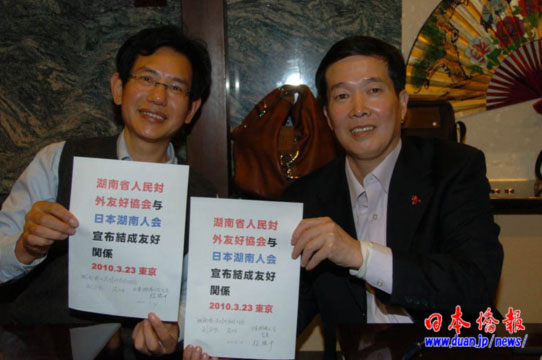 中新网3月24日电 据《日本侨报》报道,3月23日下午,正在日本访问的湖南省人民对外友好协会专职副会长庞力平一行5人,来到位于东京池袋的湖南会馆,和日本湖南人会会长副会长秘书长及部分理事等进行了座谈,双方就推进日本与湖南的交流等达成多项共识,并宣布湖南省人民对外友好协会与日本湖南人会结为友好关系。