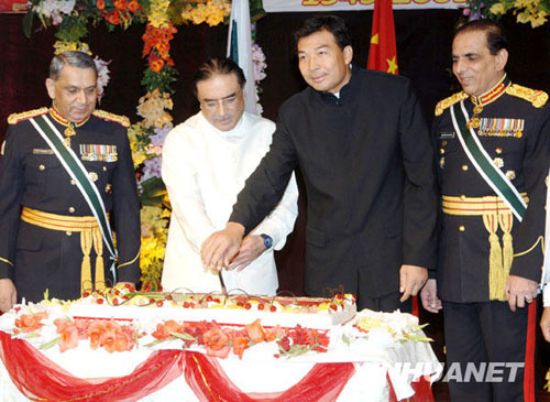 10月2日晚,在位于巴基斯坦首都伊斯兰堡的中国大使馆,巴总统扎尔达里(左二)与中国驻巴大使罗照辉共同切蛋糕庆祝新中国60华诞。当日,扎尔达里出席中国驻巴使馆举行的招待会。新华社记者李敬臣摄