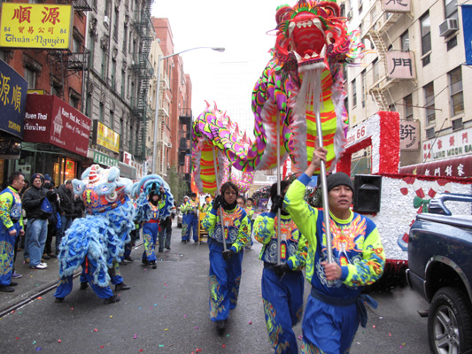 中新网12月20日电 据美国《侨报》报道,美国纽约华埠和小意大利区19日在瑞雪中迎来的“第三届东西相会圣诞大游行”,11辆装饰不同的花车、中国传统舞龙舞狮表演、少林功夫表演、各色鼓乐队演奏让东西文化在这里交汇,游行给华埠带来了浓浓的圣诞气氛。