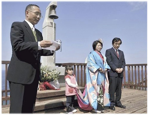 中新网3月25日电 据日本新华侨报网报道,22日,中国新娘金香与日本新郎浜崎干雄在伊豆市举行了婚礼。令这场国际婚礼别开生面的是他们选择了在伊豆市的观光名胜——恋人角举行结婚仪式,当地祝福恋人的“爱之钟”也为他们敲响。