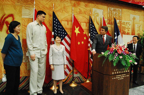 中新网4月28日电 据美国《美中信使报》报道,中国驻休斯顿总领事高燕平与美国德克萨斯州州长里克.佩里于当地时间27日下午5时在总领馆会议大厅举办“庆祝上海世博会和中国-得州友好关系”招待会。担任上海世博会形象大使的中国著名篮球明星姚明和他的妻子叶莉以及当地华人侨领及学界代表200余人应邀出席招待会。