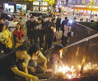 中新网5月25日电 据美国《世界日报》报道,“姚姚,一路走好”、“严惩罪犯,还小区平安”、“你的不幸,我心口的痛”、“小姚安息吧”,数十名纽约、康州和新州等地的网友当地时间23日晚9时许自发在纽约皇后区公立图书馆法拉盛分馆前举行烛光集会,悼念日前在法拉盛街头遭强暴殴打致死的姚姓中国女留学生。