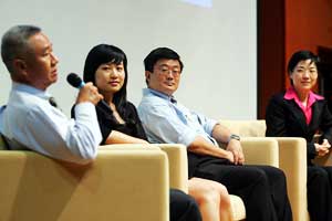 三位主讲者分别是软件公司Managed Objects亚太总经理蔡卓麟、律师钟庭辉和国大金融学助理教授张伟娜博士,他们根据各自领域的课题,分别就新加坡工作文化、法律问题和学术氛围发表演讲。