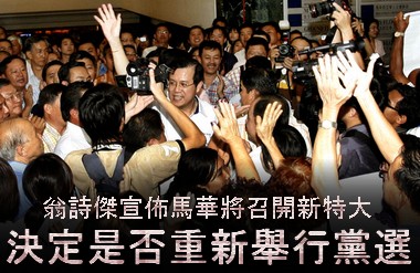 中新网10月16日电 据马来西亚《星洲日报》报道,马华总会长翁诗杰15日宣布,他已指示马华总秘书王弗明,根据党章第30.1条款召开特别代表大会,议决是否重新选举,让中央代表们在特大/常年代表大会上,决定是否要重新选任中央委员,以终结目前的僵局。