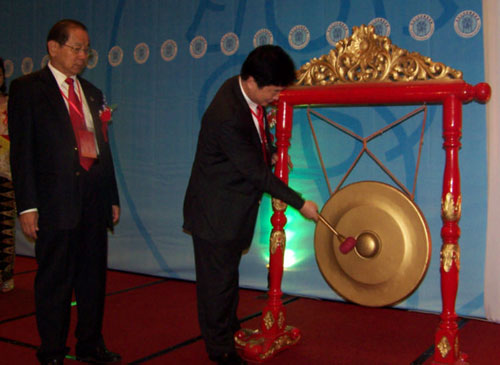 雅加达兴安会馆会长关文龙带领中共莆田市委书记杨根生上台为今次第五届世界兴安同乡恳亲大会暨第五届世界莆商大会鸣锣示意,宣布大会的正式开始。