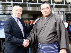 不久前刚刚获得“十两”称号的中国籍相扑力士苍国来,与出身于山鹰市的序二段大小林(原名小林央弥,22岁)等七名大力士和一位相扑比赛裁判员应活动组织者的邀请,前来为孩子们的相扑挑战赛站脚助威。(米灏)