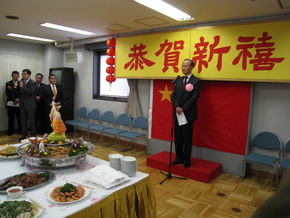 新年会在嘹亮的国歌声中开始。崔天凯大使代表中国驻日本大使馆向侨胞们致以新年的问候。他说,过去的一年对祖国人民和海外侨胞都是不平凡的一年,我们隆重举行新中国成立六十周年庆典,努力克服金融危机实现经济平稳较快增长,果断处置新疆“七五”事件维护领土主权完整和民族团结,坚持和平发展实现两岸全面“三通”等,祖国建设取得新发展,人民生活水平有新提高,中国国际地位和影响不断扩大,日益发挥着举世瞩目的重要作用。