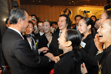 记者在现场看到,日本政经界的许多“大腕”人物出席了招待会。其中有日本参议院议长江田五月、经济产业大臣直岛正行、国家公安委员会委员长中井洽、公明党党首山口那津男、前首相福田康夫、中曾根康弘、前经济产业大臣二阶俊博、前自民党干事长中川秀直、伊吹文明,经团联会长御手洗富士夫等等。