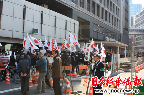 与今年1月10日的骚扰活动的套数基本一样。这些右翼分子先是讲演,内容还是反对民主党的移民政策、反对国会即将审议的具有永住权的外国人参政案,反对“东京中华街”建设构想。然后就是高喊口号,诸如“让中国人滚回去”等等。接着,就是到“阳光城”物产店马路对过,声嘶力竭地喊几句口号。
