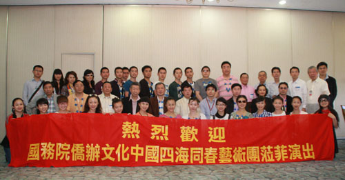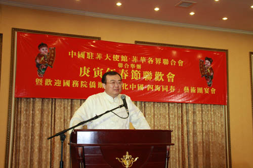 当天晚上,中国驻菲律宾大使馆和菲华各界联合会举办盛大的联欢晚宴,欢迎艺术团的到来。菲华各界联合会主席戴宏达、中国驻菲律宾大使刘建超、艺术团团长熊昌良分别发表热情洋溢的致辞。在致辞中,戴宏达主席和刘建超大使对国务院侨办组派如此高水准的艺术团来菲演出表示感谢,各位艺术家放弃在春节与家人团聚的机会,千里迢迢赴海外慰问侨胞,用欢快的歌声和舞蹈为海外侨社增添了喜庆的春节气氛。全体旅菲侨胞将翘首期盼艺术团的演出取得圆满成功。