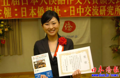 日本丽泽大学中文系三年级学生川松若菜的作文抓住“赴日中国游客激增”这一现实,以“致访问日本的中国旅行者”为题,给中国游客提出了温馨的提示和建议,获得中国驻日使馆程永华大使签署的“中国大使奖”。