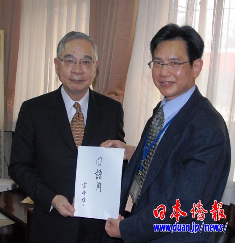 中新网4月16日电 4月15日下午,日本驻华大使馆特命全权大使宫本雄二在北京亲切会见了第五届中国人日语征文大赛主办单位代表、日本侨报社总编辑兼日中交流研究所所长段跃中和最优秀奖得主--青岛大学日语系三年级学生郭文娟。席间,段跃中向宫本雄二介绍了通过日语作文大赛在中国推广“日语角”的提议,获得宫本雄二的高度评价,当场题写了“日语角”。
