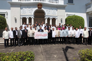 菲律宾商联总会理事长黄祯潭、菲华各界联合会主席戴宏达一行4日上午来到中国驻菲使馆,亲手向刘建超大使递交了由这两个菲华社团发动当地华人华侨为玉树灾区筹得的善款3287.7万比索(约合500万元人民币)。