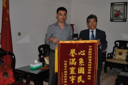 施福建家属对施遇害后,总领馆即派员与警方交涉并协助家属迅速处理死者后事表示感谢。高总领事感谢家属对总领馆工作的肯定,并强调,锦旗是对总领馆工作的鼓励,总领馆将一如既往地坚持以人为本、外交为民的理念,加大与阿司法机构合作力度,努力保障在阿中国公民的人身和财产安全。