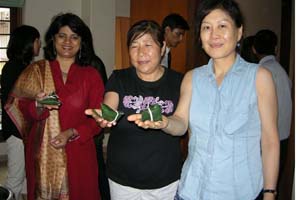 当把专门从国内带来的芦苇叶准备好后,印度朋友们都纷纷围到厨师身旁,饶有兴致地学习包粽子,仔细地询问如何铺叶、卷叶、捆扎等细节,并动手制作。粽子煮熟后,印度朋友们高兴地品尝了她们称之为“中国布丁”的美食,并称赞粽子味道很美。