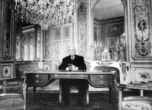 戴高乐的上台,标志着法兰西第五共和国的建立,爱丽舍宫自然也为此进行了全面改造。戴高乐将总统办公室安置在二楼中心位置的金厅(Salon doré)。植根传统的戴高乐在金厅的内部布局和装饰风格上并未做太多改动,基本上保持了第二帝国时期的风貌。吊顶用的是拿破仑三世的水晶分枝吊灯,座椅基本上也都是由米歇尔-维克多·克律谢(Michel-Victor Cruchet,1815-1899)设计的帝国时期的椅子。办公室墙面以灰色为底色,点缀金黄色,挂着法国著名的博韦挂毯(tapisserie de Beauvais)。他用的办公桌是前总统福尔(Félix Faure)带到爱丽舍宫的。这个桌子由著名木器制作者克里桑(Charles Cressent)设计,用红色和紫色的桃花心木制成。办公桌上,戴高乐用的是比昂内(Martin-Guillaume Biennais,1764-1843)设计的桌灯,这盏桌灯是拿破仑一世时期留下的,前任总统福尔、奥里奥尔(Vincent Auriol)、科蒂(RenéCoty),以及戴高乐之后的蓬皮杜、密特朗和希拉克总统也都延用了这盏台灯。戴高乐还在办公室内摆放了一张由瓦斯米斯(Henri Léonard Wassmus)于1856设计的大圆桌。整个办公室充满了传统气息。