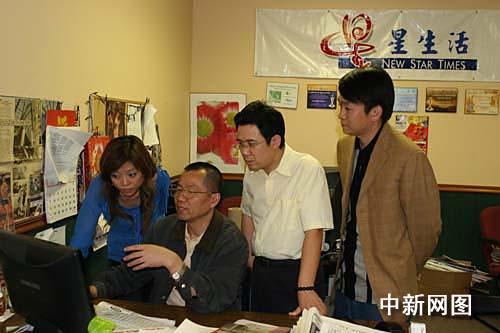 夏春平在星星生活周报编辑部向报社老总袁志强(右二)和主编介绍中新社供稿服务系统。捷克佳摄