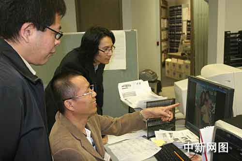 在温哥华明报编辑部,夏春平向报社高层介绍中新社供稿服务系统。