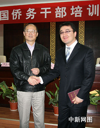 赵阳(左)为第43期全国侨务干部培训班学员颁发结业证书。