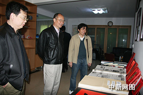 国侨办副主任赵阳(中)在中新社副总编孙永良(左)等的陪同下视察中新社湖南分社。