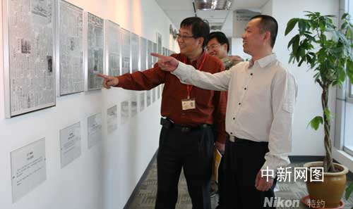 新加坡《联合早报》总编辑林任君陪同夏春平参观《联合早报》报史长廊。