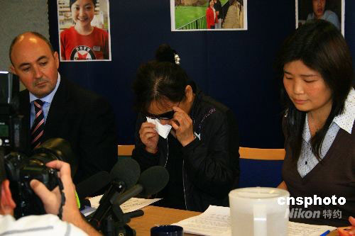图为杨振兴的妈妈曲淑珍(中)在诺森比亚警局宣读一份声明,呼吁知情者提供线索。中新社发 李鹏 摄
