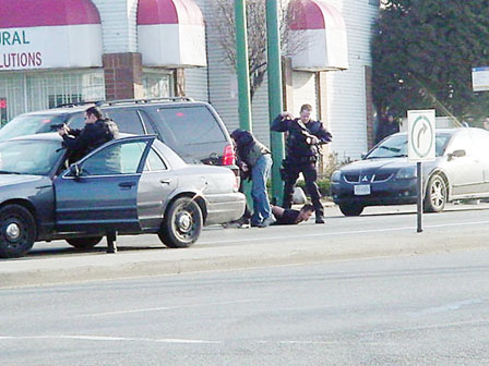 而另一名拘捕疑犯的现场位于东南海旁大道(S.E. Marine Dr.)夹缅街(Main St.),该处油站便利店东主Jason表示,十字路口附近一辆白色Audi多用途越野车,被7辆包括无标记警车包围。