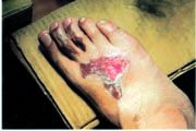 拖着裹着纱布的右脚,陈忠荣15日在朋友的搀扶下一瘸一拐地来到华埠全美反餐馆暴力联盟主席黄克锵办公室求援。陈忠荣说,上月22日晚,与他一同做工的工友正在用一盆具有高强度酸性清洁剂LYE与滚开的热水洗烫炉,陈忠荣路过时,工友不小心将混有此高腐蚀性清洁剂的热水洒在他的右脚上。陈忠荣顿时疼痛难忍,被送往医院进行救治。