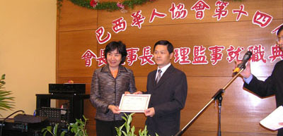 中新网9月19日电 据巴西侨网报道, 巴西华人协会第14届理监事就职典礼17日晚隆重举行,中国驻圣保罗总领事李姣云、圣保罗各侨团代表一百多人观礼,并向以吴耀宙为会长、李少玉为监事长的新一届理监事表示热烈祝贺。